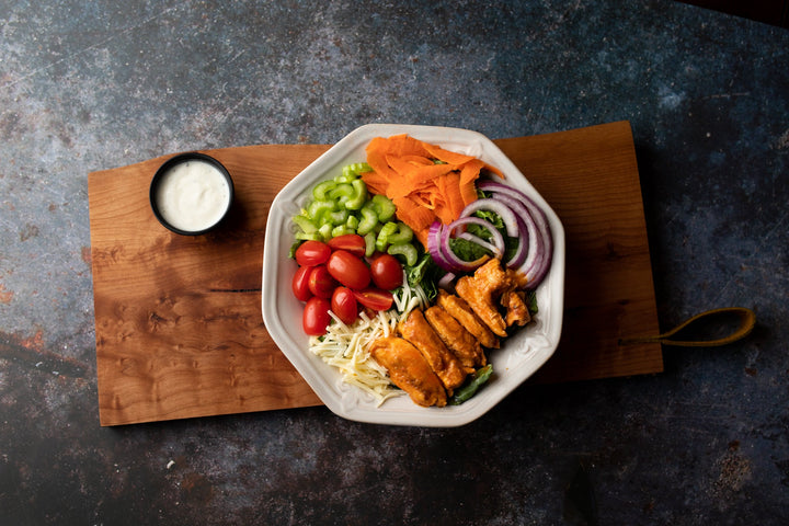 Your taste buds will enjoy grilled chicken breast with buffalo sauce, cherry tomatoes, shredded cheese, celery, shaved carrots, and red onion over lettuce. Served with ranch or blue cheese dressing on the side. GLUTEN-FREE