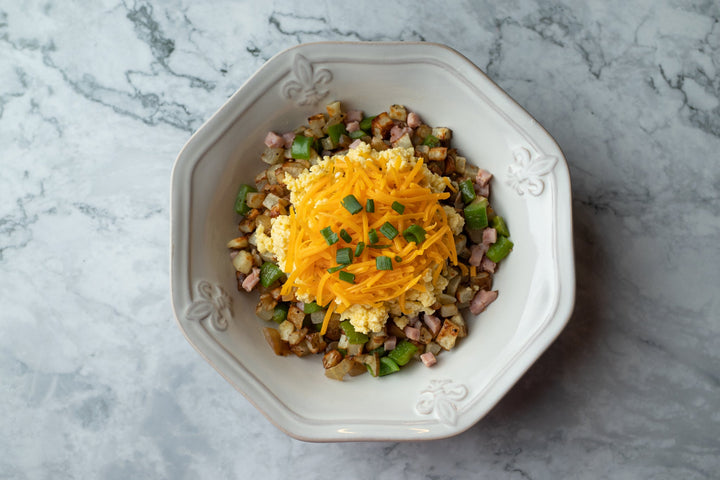 This bowl comes with ham, russet potatoes, green peppers, onions, scrambled eggs, shredded cheese, and some green onions on top. YES!!!! GLUTEN-FREE