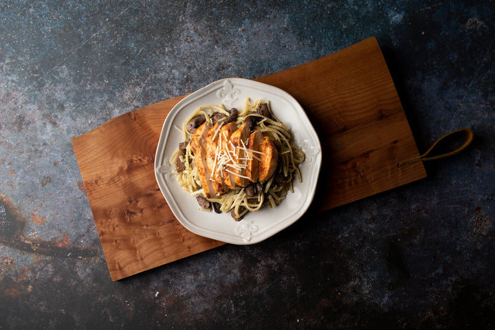 Linguine mixed with pesto sauce, sauteed mushrooms sizzled in white wine with chicken breast.